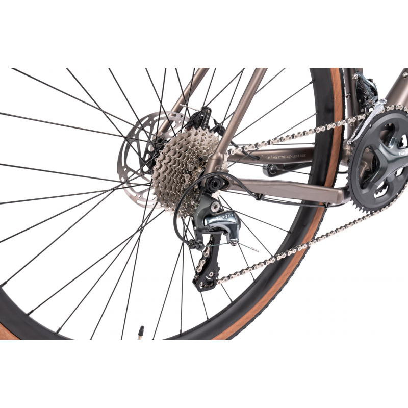 The warm matte grey finish gives the bike a modern yet understated look – clean, refined and easy to pair with bags and components, ideal for riders who prefer a subtle, elegant aesthetic.