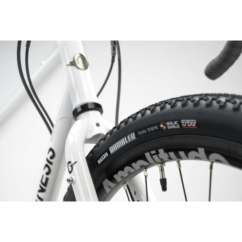 The Genesis Mjolnir chromoly steel frame and Amplitude G100 chromoly fork form a platform intended for mixed-surface riding, featuring internal cable routing, dropper post compatibility, and tubeless-ready wheels and tyres.